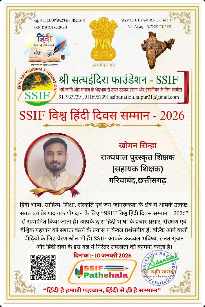 *गरियाबंद*: शिक्षा एवं साहित्य के क्षेत्र में उल्लेखनीय योगदान हेतु गरियाबंद जिले के राज्य पुरस्कार प्राप्त शिक्षक एवं साहित्यसेवी खोमन सिन्हा को सत्यदीप फाउंडेशन (SSIF), नई दिल्ली द्वारा प्रतिष्ठित “SSIF हिंदी साहित्य सम्मान–2026” से सम्मानित किया गया है। यह सम्मान उन्हें हिंदी भाषा एवं साहित्य के प्रचार–प्रसार, रचनात्मक लेखन तथा शैक्षिक नवाचारों में निरंतर सक्रिय भूमिका निभाने के लिए प्रदान किया गया।