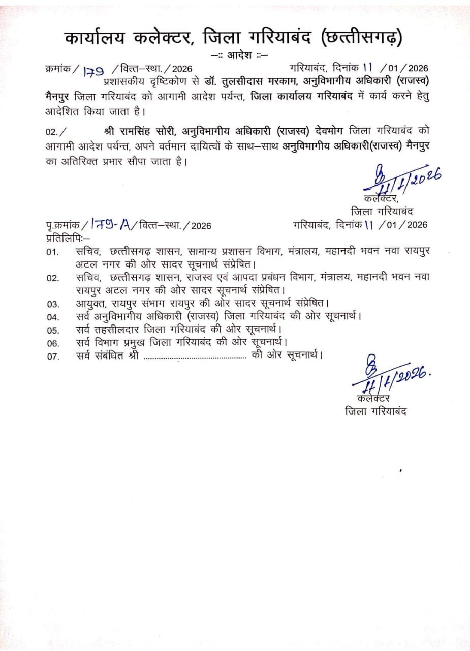प्रशासनिक हित एवं कार्यव्यवस्था की सुचारुता को दृष्टिगत रखते हुए कलेक्टर द्वारा तुलसीदास मरकाम को आगामी आदेश तक जिला कार्यालय गरियाबंद में संलग्न किया गया है। साथ ही अनुविभागीय अधिकारी (राजस्व) देवभोग राम सिंह सोरी को अपने वर्तमान दायित्वों के अतिरिक्त मैनपुर अनुविभाग का अतिरिक्त प्रभार सौंपा गया है।