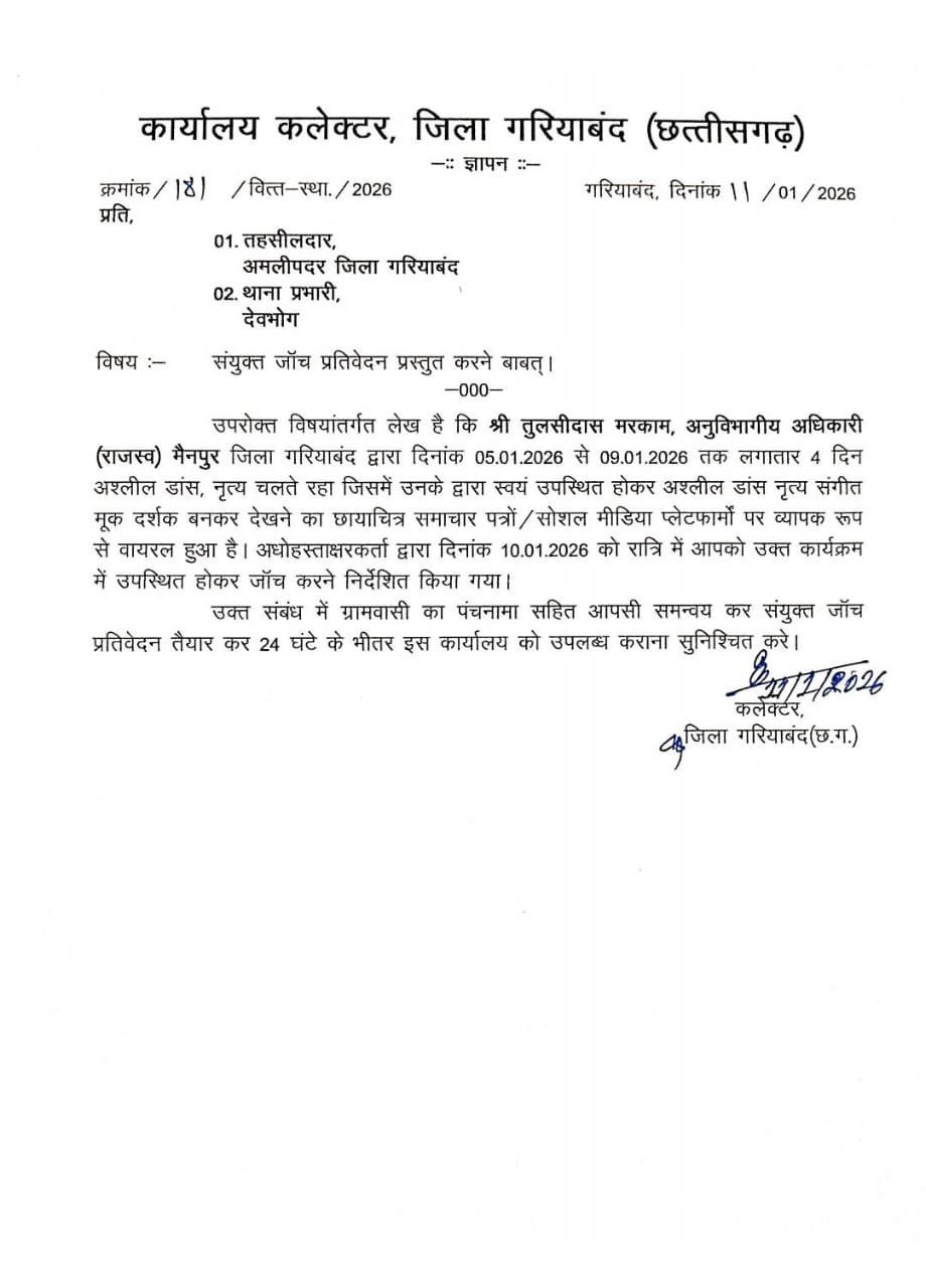इसी क्रम में कलेक्टर कार्यालय गरियाबंद द्वारा तहसीलदार अमलीपदर एवं थाना प्रभारी देवभोग को भी संयुक्त जांच प्रतिवेदन प्रस्तुत करने के निर्देश दिए गए हैं। आदेशानुसार 5 से 9 जनवरी 2026 के बीच अमलीपदर क्षेत्र में आयोजित कार्यक्रम का वीडियो सोशल मीडिया पर वायरल होने के बाद संज्ञान लेते हुए जांच के निर्देश जारी किए गए। संबंधित अधिकारियों को आपसी समन्वय से जांच कर 24 घंटे के भीतर प्रतिवेदन कलेक्टर कार्यालय में प्रस्तुत करने को कहा गया है।