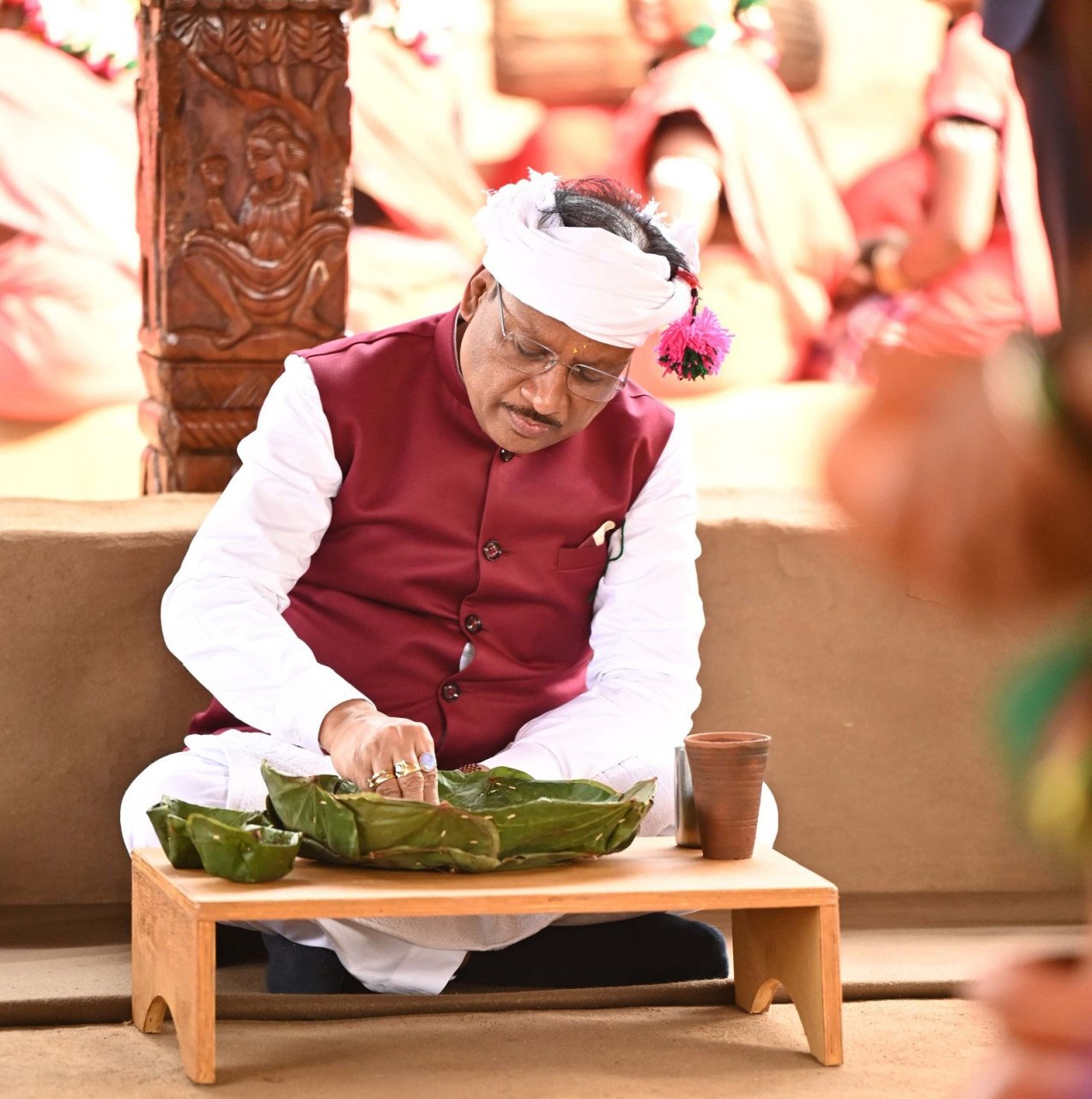 मुख्यमंत्री साय ने घोटुल परिसर के लेय्योर एवं लेयोस्क कुरमा: युवाओं और युवतियों के लिए निर्मित कक्षों के साथ ही बिडार कुरमा: पारंपरिक वेशभूषा, प्राचीन वाद्ययंत्र एवं सांस्कृतिक सामग्रियों का संग्रह का निरीक्षण किया। इस दौरान ग्रामीणों की आग्रह पर मुख्यमंत्री साय ने सगा कुरमा में बस्तर के पारंपरिक व्यंजनों का स्वाद लेकर क्षेत्र की खान-पान संस्कृति का सम्मान किया। इस दौरान मुख्यमंत्री के भोजन में विशेष रूप से भोजन गाटो-भात, कोदो-भात, उड़िद दार, हिरुवा दार, जीरा भाजी, कनकी पेज, भाजी घिरोल फुल, चाटी भाजी, कांदा भाजी, मुनगा भाजी, इमली आमट, मड़िया पेज, टमाटर चटनी, चिला रोटी, रागी कुरमा, रागी केक, रागी लट्टू, रागी जलेबी परोसा गया।