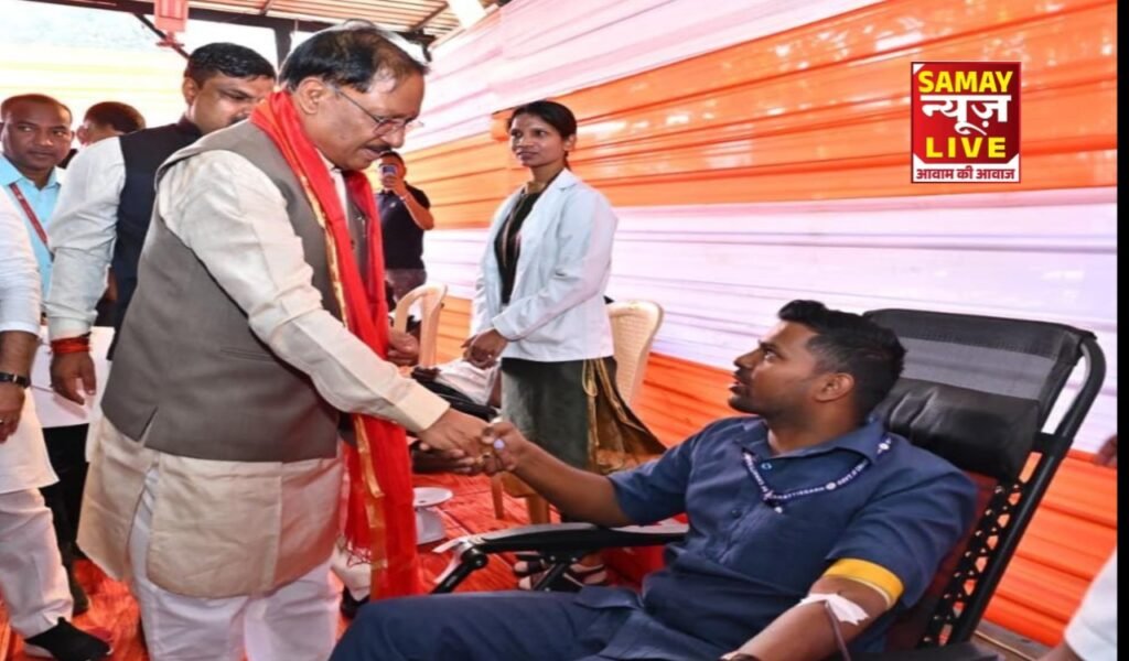 रायपुर :—मुख्यमंत्री विष्णु देव साय ने अपने 62वें जन्मदिन के अवसर पर राजधानी रायपुर स्थित मुख्यमंत्री निवास परिसर में आयोजित रक्तदान शिविर का शुभारंभ किया। इस अवसर पर उन्होंने भगवान धन्वंतरि की पूजा-अर्चना की तथा रक्तदाताओं को सम्मानित कर उन्हें प्रोत्साहित किया। मुख्यमंत्री के 62वें जन्मदिन के अवसर पर अल्फा ग्लोब फाउंडेशन, रायपुर तथा शिवनाथ ब्लड सेंटर द्वारा 62 लोगों के रक्तदान की विशेष व्यवस्था की गई थी।