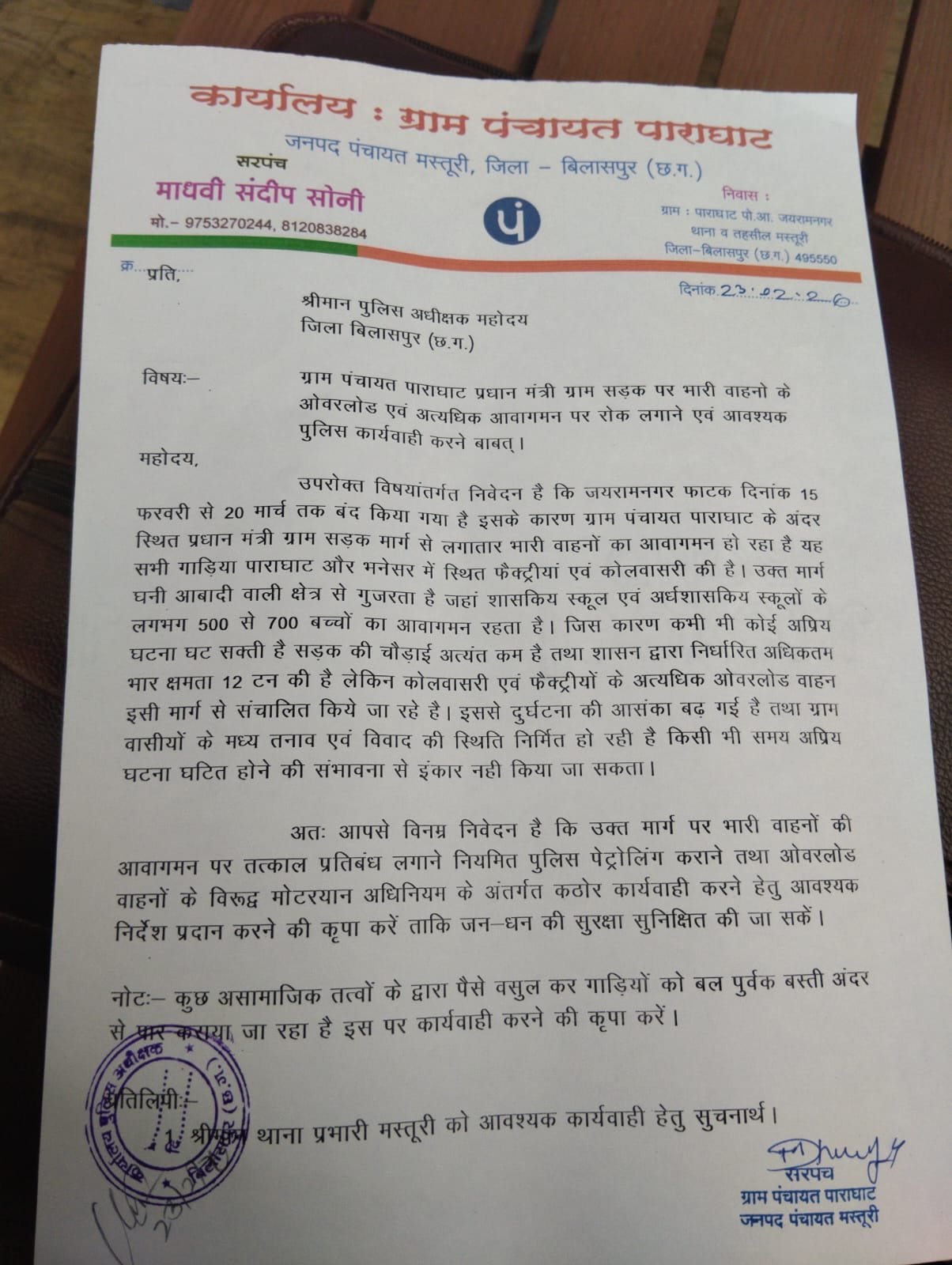 बिलासपुर जिले के मस्तूरी विकासखंड अंतर्गत ग्राम पंचायत पराघाट से एक महत्वपूर्ण मामला सामने आया है। ग्राम पंचायत कार्यालय की ओर से पुलिस अधीक्षक बिलासपुर को एक लिखित पत्र भेजकर भारी वाहनों की आवाजाही पर रोक लगाने की मांग की गई है।