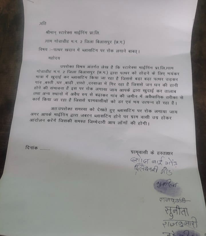 सीपत ,,,,मस्तूरी विकासखंड के ग्राम पंचायत गोडाडीह क्षेत्र में संचालित जिन्दल माइंस में कार्य कर रहे स्टारेक्स माइनिंग प्रा. लि. की पत्थर खदान में हो रही तेज़ और लगातार नियमविरुद्ध ब्लास्टिंग से ग्रामीणों में भारी आक्रोश और भय का माहौल है। ग्रामीणों का आरोप है कि पत्थर तोड़ने के लिए अत्यधिक मात्रा में की जा रही विस्फोटक खुदाई से बड़े-बड़े पत्थर उछलकर गांव की बस्ती, घरों, आंगन, खेत-बाड़ी और रास्तों तक आ गिर रहे हैं, जिससे कभी भी बड़ी जनहानि और संपत्ति नुकसान की आशंका बनी हुई है।