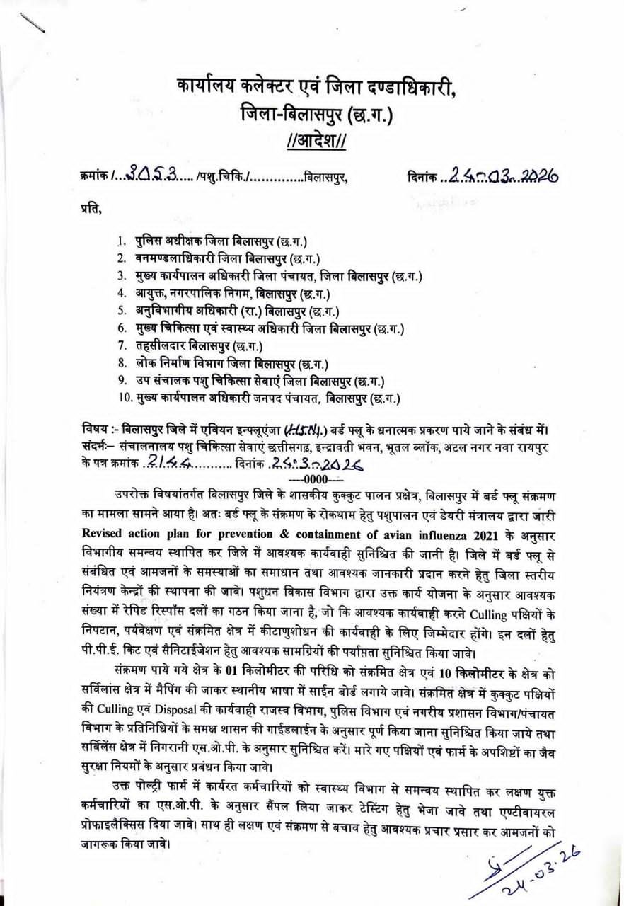 बिलासपुर, :— जिले में बर्ड फ्लू की पुष्टि होते ही प्रशासन पूरी तरह सक्रिय हो गया है। कलेक्टर संजय अग्रवाल एवं वरिष्ठ पुलिस अधीक्षक रजनेश सिंह ने आज देर रात बर्ड फ्लू से प्रभावित कोनी क्षेत्र का संयुक्त दौरा कर स्थिति का जायजा लिया। निरीक्षण के दौरान अधिकारियों ने प्रभावित क्षेत्र में की जा रही कार्रवाई की समीक्षा की और मौके पर मौजूद स्वास्थ्य, पशुपालन एवं नगर निगम की टीमों को आवश्यक दिशा-निर्देश दिए। जिला पंचायत सीईओ संदीप अग्रवाल भी दौरे में उपस्थित थे।