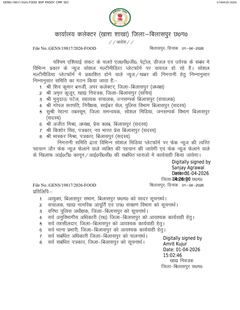 बिलासपुर, :— पश्चिम एशिया में उत्पन्न परिस्थितियों के बीच एलपीजी, पेट्रोल, डीजल एवं उर्वरक की उपलब्धता को लेकर सोशल मीडिया पर भ्रामक खबरों के प्रसार को गंभीरता से लेते हुए जिला प्रशासन ने कड़ा कदम उठाया है। कलेक्टर संजय अग्रवाल के निर्देश पर सोशल मीडिया प्लेटफॉर्म्स पर प्रसारित होने वाली खबरों की निगरानी के लिए एक विशेष समिति का गठन किया गया है।