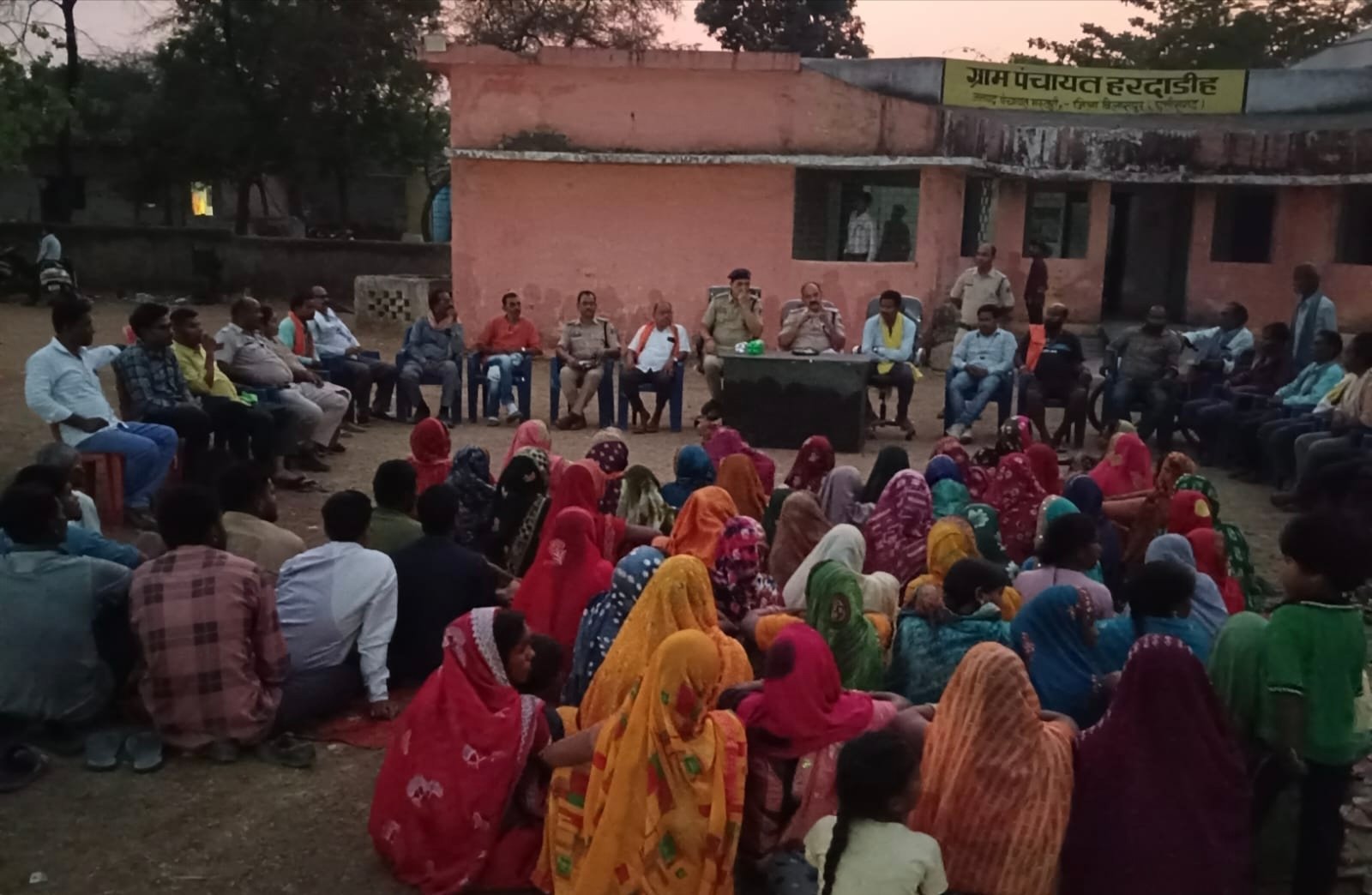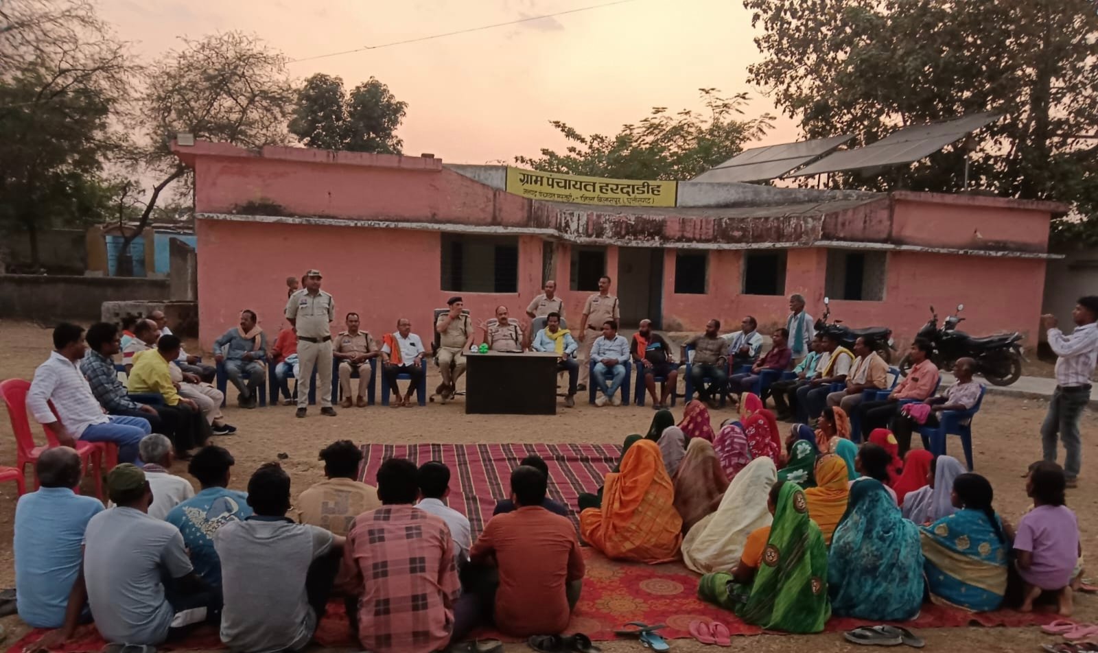 सीपत,,,,हरदाडीह में लगी चौपाल उप महानिरीक्षक और वरिष्ठ पुलिस अधीक्षक रजनेश सिंह द्वारा आम जनता से पुलिस से सीधे संवाद स्थापित करने के उद्देश्य से जिले में बीट प्रणाली लागू की गई है और पुलिस अधिकारी/ आरक्षकों द्वारा सीधे गांव और मोहल्ले जाकर जनता से मिलकर उनकी समस्या सुनकर उसका निराकरण किया जा रहा है और आम जनता को नशे के दुष्प्रभाव,यातायात नियमों की जानकारी,साइबर फ्रॉड के संबंध में जाकरुक किया जा रहा है