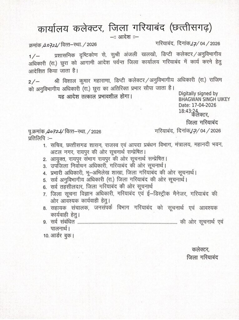 गरियाबंद में प्रशासनिक फेरबदल: अंजली खलखो जिला कार्यालय अटैच, विशाल महाराणा को छुरा एसडीएम का अतिरिक्त प्रभार">