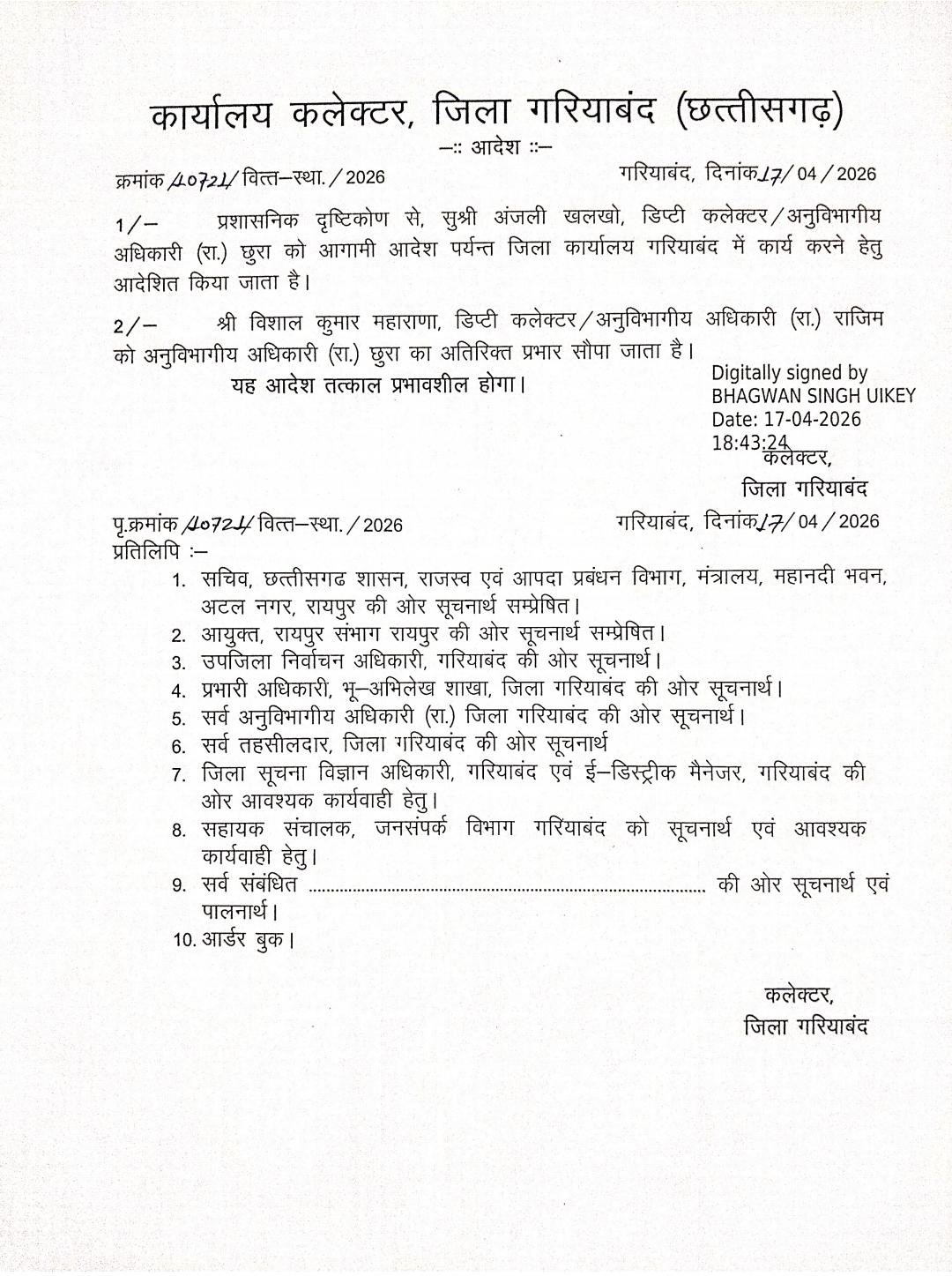गरियाबंद में प्रशासनिक फेरबदल: अंजली खलखो जिला कार्यालय अटैच, विशाल महाराणा को छुरा एसडीएम का अतिरिक्त प्रभार