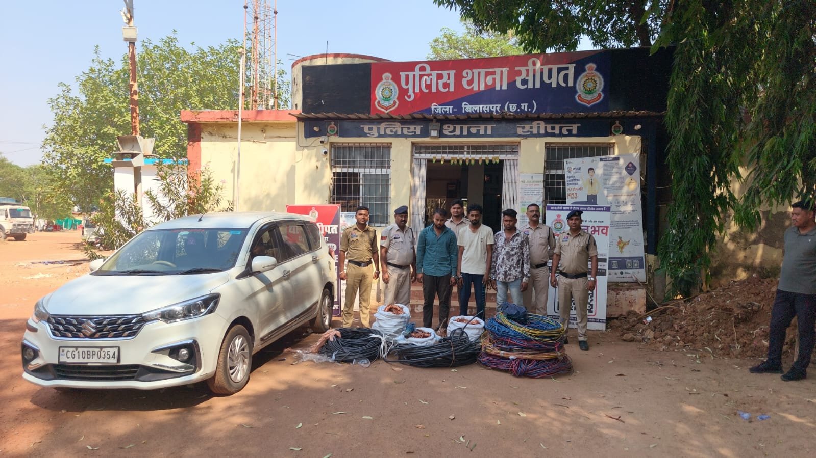 सीपत ,,,,, सीपत थाना क्षेत्र अंतर्गत 19अप्रैल को मुखबिर से सूचना मिली की ग्राम खम्हरिया के सोंठी रोड बाजार के पास कुछ लड़कों की गतिविधियां संदिग्ध है वे दिन में रूम में रहते हैं और रात के समय एक आर्टिका कार से घूमने निकलते हैं सूचना पर तत्काल थाना प्रभारी सीपत के द्वारा टीम तैयार कर आरोपियों को पकडने के निर्देश मिलने पर आरोपी शहबाज अली एवं उसके अन्य साथी को घेरा बंदी कर पकड़ा गया और उन्हें हिरासत में लेकर पूछताछ किया गया जो शुरू में तो गुमराह करने की कोशिश किए परंतु ज्यादा देर तक झूठ नहीं बोल पाए हिकमतमली से पूछताश करने पर बताए कि वे चार पांच माह पूर्व से शहबाज अली अपने साथी 1. जगदीश कुमार पटेल पिता दुजराम पटेल उम्र 24 साल निवासी ग्राम खम्हरिया थाना सीपत 2. मोईउद्दीन पिता समसुद्दीन उम्र 27 साल निवासी खम्हरिया थाना सीपत एवं तीन अपचारी बालको के साथ मिलकर एक सफेद रंग की आर्टीका कार में धूमधुम कर तखतपुर, काठाकोनी, चोरभट्ठी, गनियारी, जयाराम नगर मुंगेली जिलों में कई जगहों पर,कुंडा कबीरधाम , अकलतरा कोरबा आदि जगहो से मोबाईल टावर में लगे केबल कॉपर वायर और एल्युमिनियम तार को चोरी कर रहे हैं आरोपियों की निशान देही पर उनसे चोरी का सामन, छीला हुआ कापर केबल वायर वजन 1क्विंटल दो किलोग्राम कीमती 1,22,400 रूपये, काले रंग के प्लास्टिक कोडेड कापर वायर का बंडल वजन 54 किलोग्राम कीमती 1,08,000 रूपये, बारह बंडल एल्युमिनीयम का तार कीमती 60,000 रूपये जुमला कीमती 2,90,400 रूपये को और एक आर्टिका कार सफेद रंग की बरामद किया गया आरोपियो को गिरफ्तार कर न्यायिक रिमांड पर एवं अपचारी बालको को किशोर न्याय बोर्ड बिलासपुर भेजा गया।