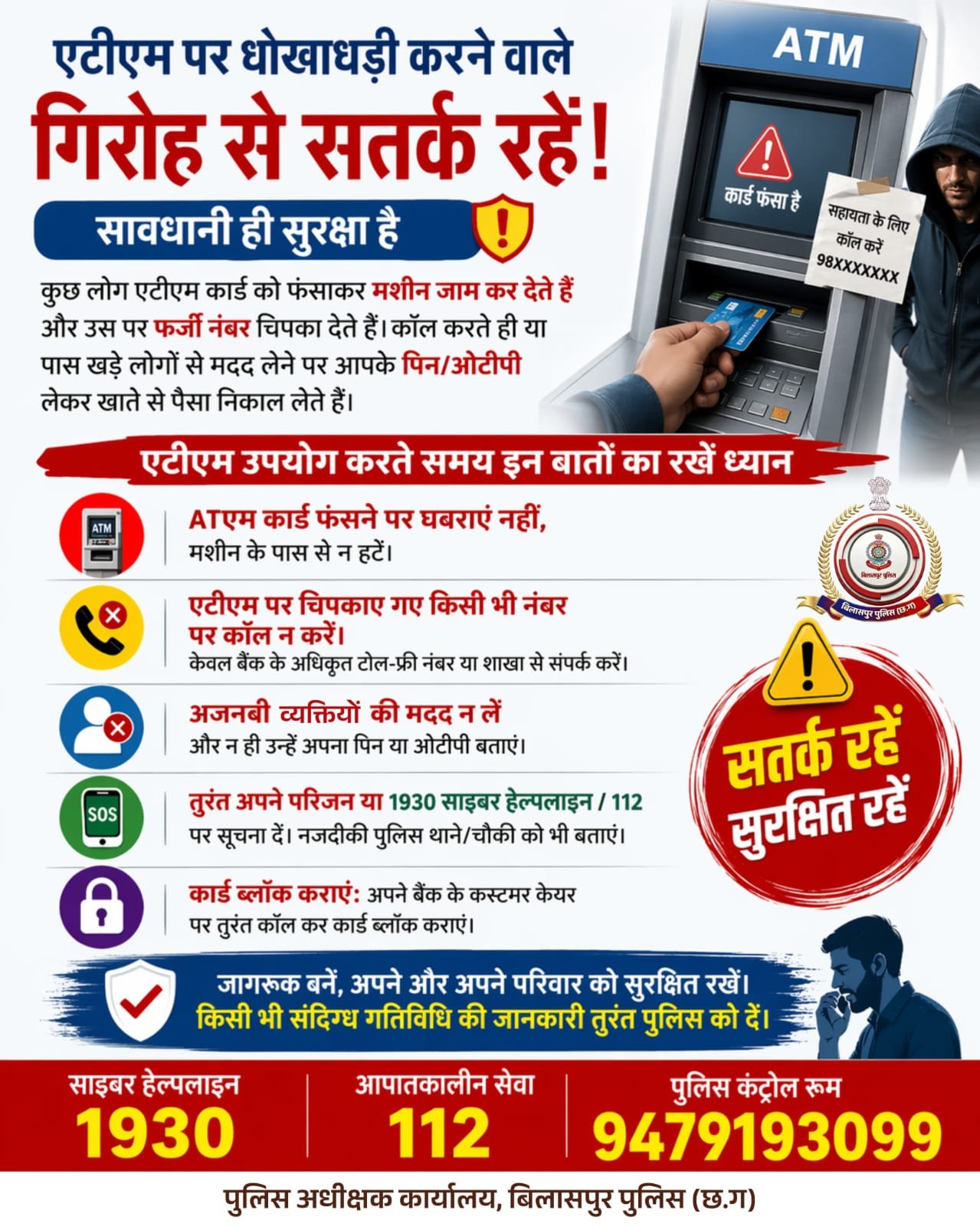 बिलासपुर:—एटीएम का इस्तेमाल करते समय जरा सी गलती आपको भारी पड़ सकती है। इन दिनों ठग नए-नए तरीकों से लोगों को निशाना बना रहे हैं। एटीएम मशीन में छेड़छाड़ कर कार्ड फंसाना और फिर आपके पिन या ओटीपी की जानकारी हासिल कर पैसे निकाल लेना—यह एक आम ठगी का तरीका बन चुका है।