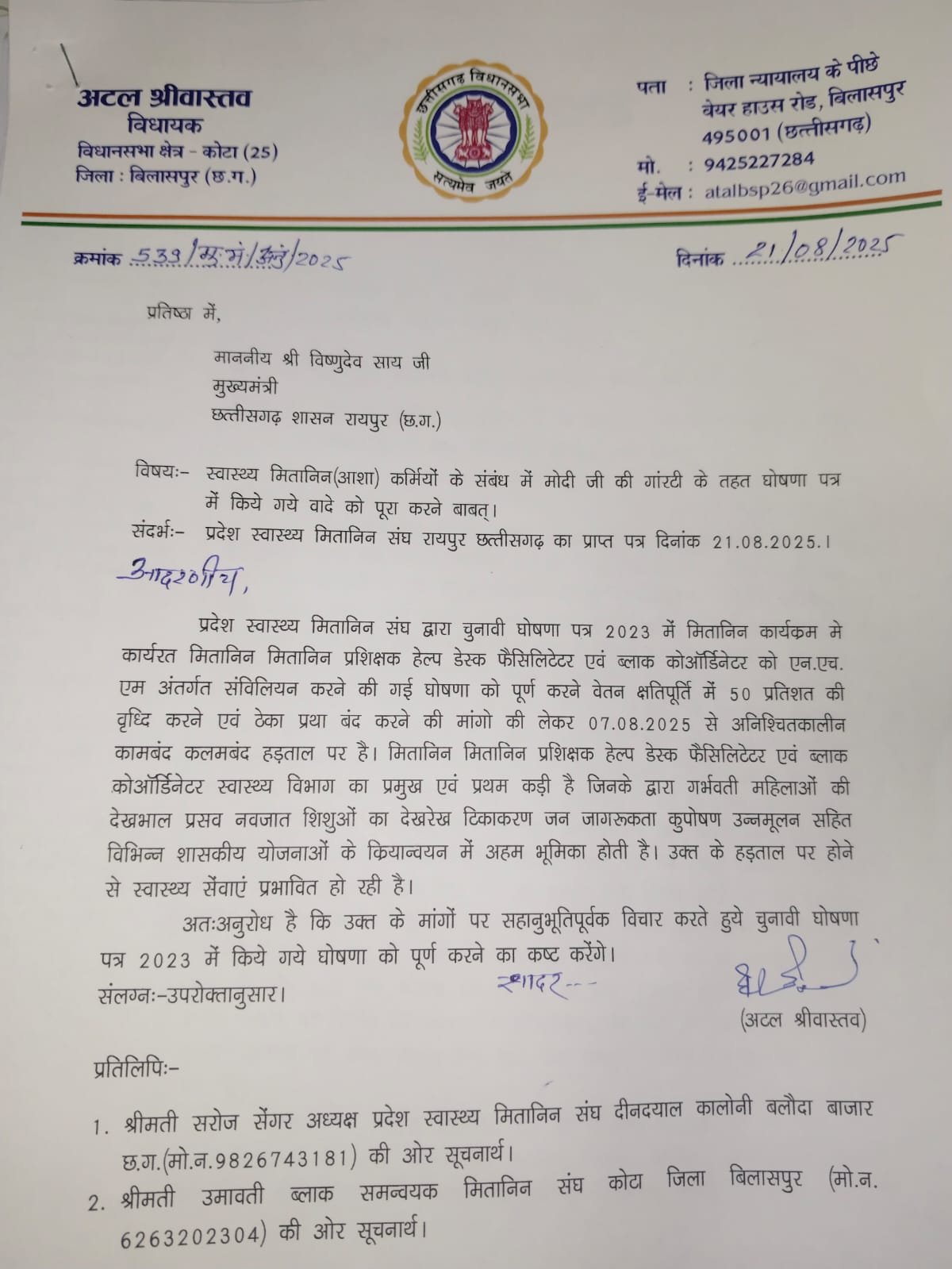 कोटा विधायक अटल श्रीवास्तव ने मितानिन संघ द्वारा किए जा रहे हड़ताल का समर्थन करते हुए मुख्यमंत्री को मितानिनों के मांग को पूर्ण करने पत्र लिखा। कोटा विधायक ने कहा कि मितानिन संघ भाजपा के घोषणा पत्र में किए गए वायदे को पूरा करने सविलियन करने तथा वेतन वृद्धि करने की मांगों को लेकर अनिश्चित कालीन हड़ताल पर है।