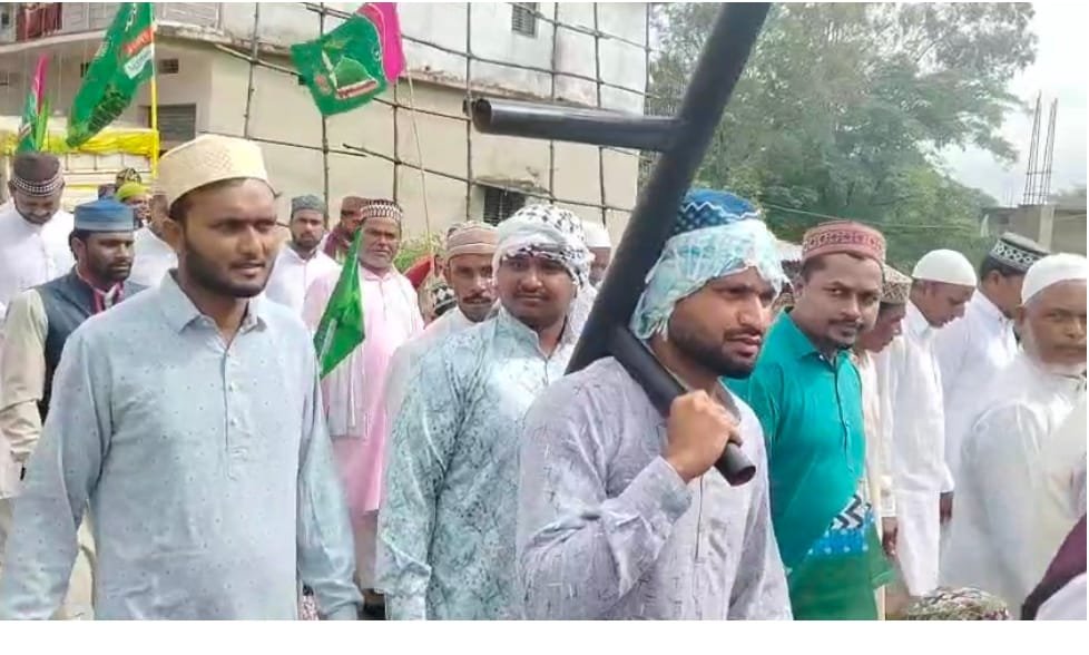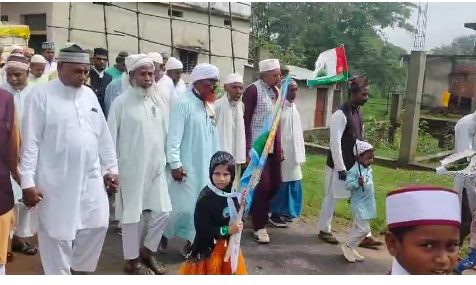 जुलूस में नबी के दीवाने नतिया तराना में झूमते दिखे सभी एक जैसे लिबास पहन के जुलूसे मोहम्मदी के झंडे के साथ-साथ तिरंगे झंडे भी लेकर चल रहे थे