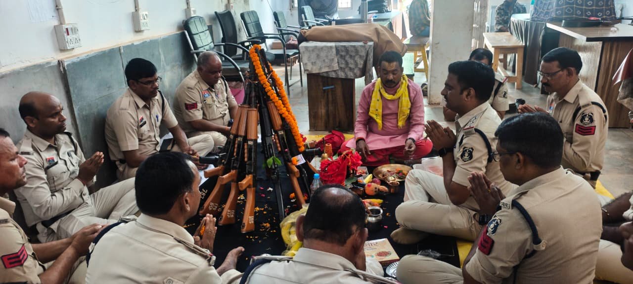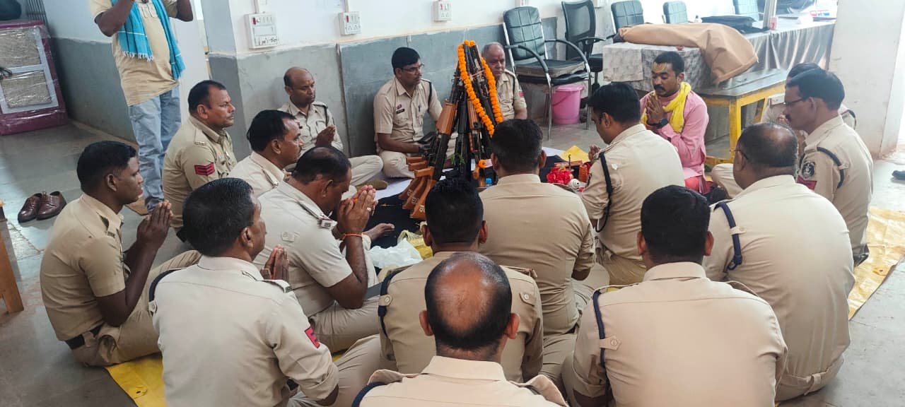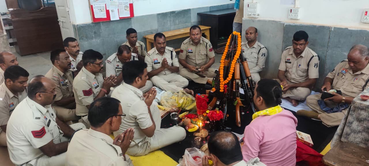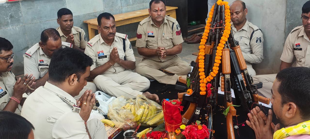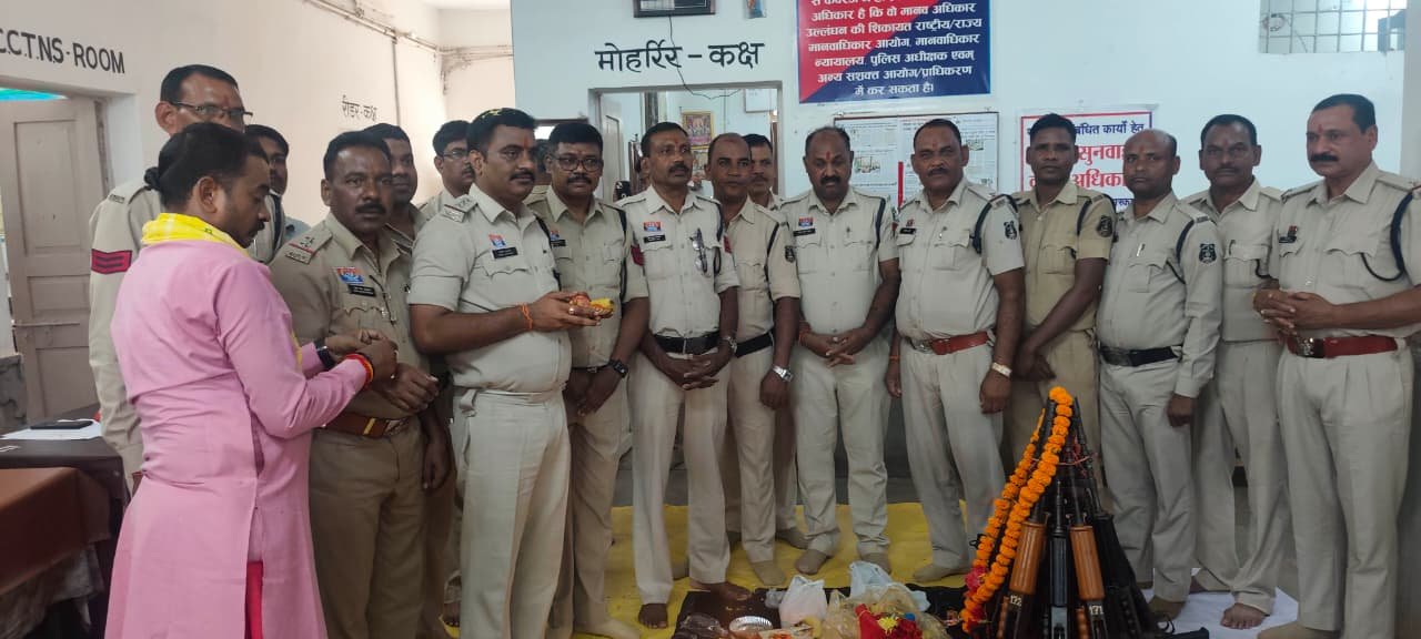 पुजा स्थान पर पिस्टल कारतूस,बंदूक,इंसास, एसएलआर एवं अन्य शस्त्रों की पूजा सीपत थाना प्रभारी गोपाल सतपथी एवं स्टाफ के द्वारा किया गया l