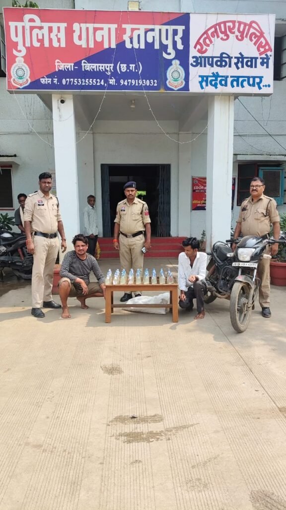 रतनपुर…रतनपुर पुलिस के द्वारा शराब कोचियों पर लगातार की जा रही कार्यवाही। मदनपुर थाना रतनपुर जिला बिलासपुर छ.ग.।पुलिस अधीक्षक बिलासपुर रजनेश सिंह (भा.पु.से.) के द्वारा जिले में नशे के कारोबारियों पर लगातार कार्यवाही करने निर्देशित किया गया है। जिसके परिपालन में दिनाँक 01/10/2025 को मुखबीर से सुचना मिला कि दो व्यक्ति मोटर सायकल में देशी शराब दुकान से भारी मात्रा में देशी प्लेन शराब बिक्री हेतु ग्राम मदनपुर की ओर लेकर जा रहे हैं, कि सुचना पर रेड कार्यवाही हेतु थाना रतनपुर से टीम रवाना हुई थी, खण्डोबा मंदिर के पास पुलिस टीम द्वारा रेड कार्यवाही कर मोटर सायकल सवार दो व्यक्तियों 1. राकेश साहू, 2. सोहन साहू निवासी मदनपुर के कब्जे से 52 पाव देशी प्लेन शराब कुल 9.360 लीटर कीमती 4160 रूपये व परिवहन में प्रयुक्त मोटर सायकल को जप्त कर उक्त व्यक्तियों के विरूद्ध आबकारी एक्ट की कार्यवाही कर आरोपियों को न्यायिक रिमाण्ड पर भेजा गया। गिरफ्तार आरोपी –1.राकेश साहू पिता प्रेमलाल साहू उम्र 35 वर्ष, 2.सोहन साहू पिता पुसउ साहू उम्र 37 वर्ष दोनों निवासी उक्त कार्यवाही में थाना प्रभारी निरीक्षक संजय सिंह राजपूत, प्र.आर बलदेव सिंह, आर. देवानंद चंद्राकर, आकाश डोंगरे, धनराज कुम्भकार, हरिशंकर चंद्रा का विशेष योगदान रहा।