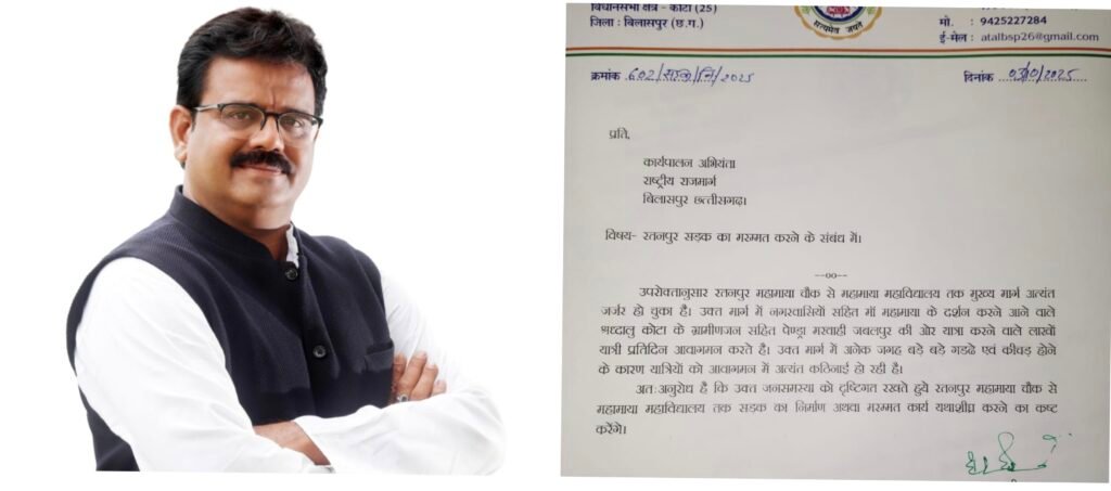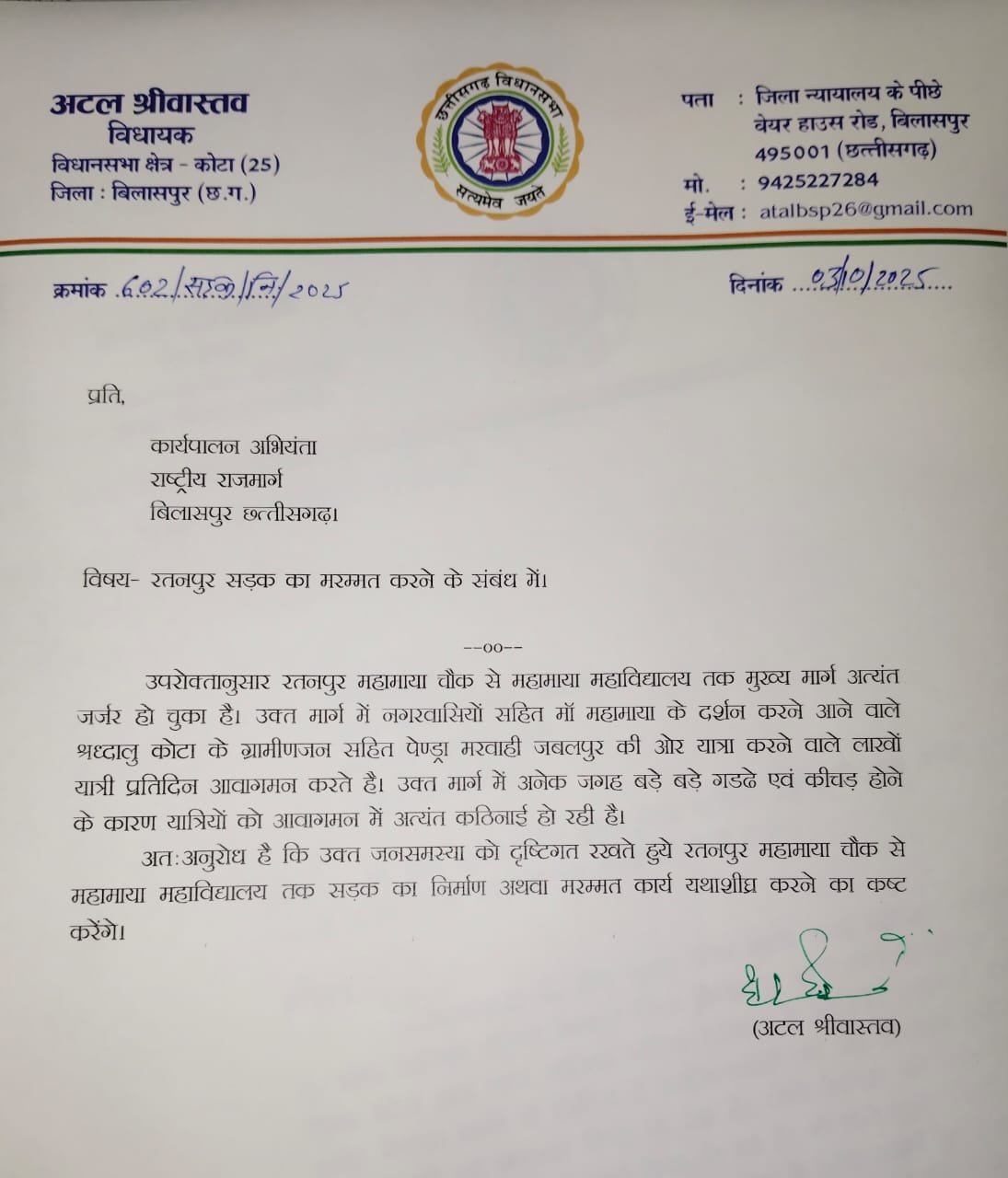 रतनपुर…. कोटा विधायक अटल श्रीवास्तव ने महामाया चौक रतनपुर से शासकीय महामाया महाविद्यालय तक जर्जर हो चुकी पेंड्रा रोड को नवीन निर्माण अथवा मरम्मत के लिए कार्यपालन अभियंता राष्ट्रीय राजमार्ग बिलासपुर को पत्र प्रेषित किया है।ज्ञात हो कि रतनपुर के लोगों द्वारा महामाया चौक से कालेज की ओर जाने वाली जर्जर हो चुकी और धूल के गुबार से भरी सड़क के मरम्मत व निर्माण के लिए काफी समय से मांग की जा रही है।गत दिनों बीते नवरात्र पर्व पर भी मुख्यमंत्री सहित कई बड़े नेता मंत्री सहित विशिष्ट जनों का आगमन रतनपुर महामाया मंदिर दर्शन हेतु हुआ जिसका रास्ता भी इसी जर्जर सड़क से होकर जाता है फिर भी किसी ने सुध नहीं ली।