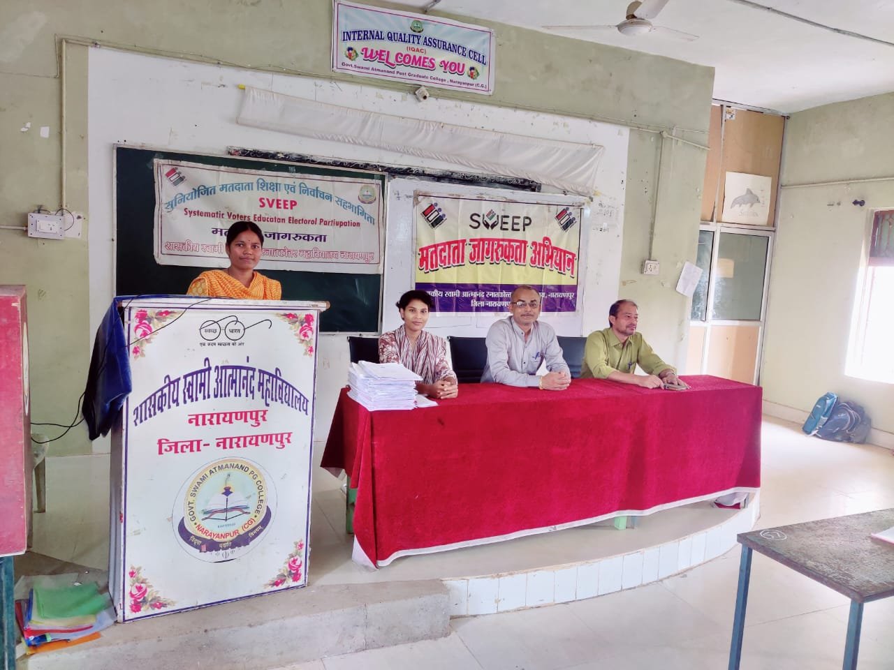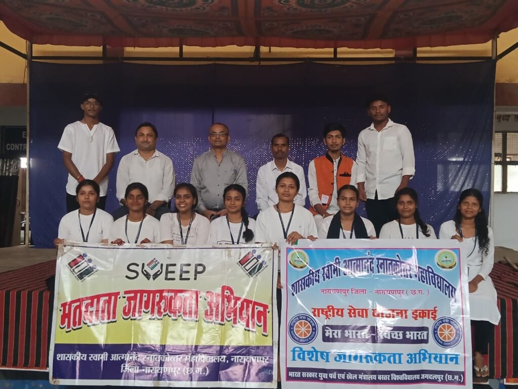 भारत निर्वाचन आयोग, नई दिल्ली के निर्देशानुसार कलेक्टर एवं जिला निर्वाचन अधिकारी जिला नारायणपुर के मार्गदर्शन में स्वीप कार्ययोजना के तहत राज्य के समस्त उच्च शैक्षणिक संस्थानों में 01 से 15 अक्टूबर 2025 तक मतदाता जागरूकता से संबंधित विभिन्न कार्यक्रम आयोजित किया किया जा रहा है इस कार्यक्रमों का उद्देश्य उच्च शैक्षणिक संस्थाओं में अध्ययनरत युवाओं को मतदान प्रक्रिया से जोड़ने एवं आमजनों के मध्य मतदाता जागरूकता को बढ़ाने के उद्देश्य से ।