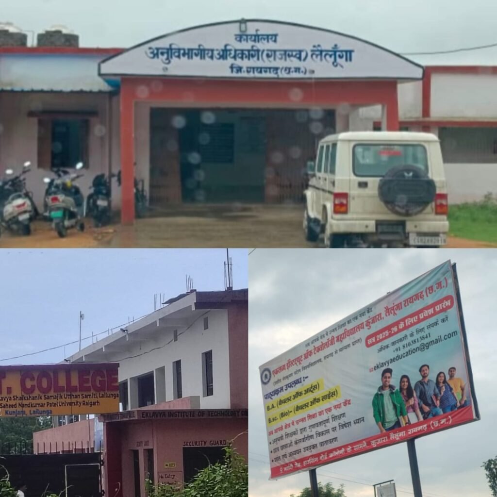 लैलूंगा (कुंजारा): —-राजस्व विभाग से जुड़ा एक गंभीर मामला कुंजारा गांव में उजागर हुआ है, जहाँ बिना किसी वैध आदेश के भूमि नक्शे में हेरफेर किए जाने का आरोप सामने आया है। बताया जा रहा है कि इस विवाद का संबंध एकलव्य इंस्टिट्यूट ऑफ़ टेक्नोलॉजी महाविद्यालय के भूमि क्षेत्र से जुड़ा हुआ है, जिससे पूरा क्षेत्र चर्चाओं में है और प्रशासनिक गलियारों में हड़कंप मच गया है।