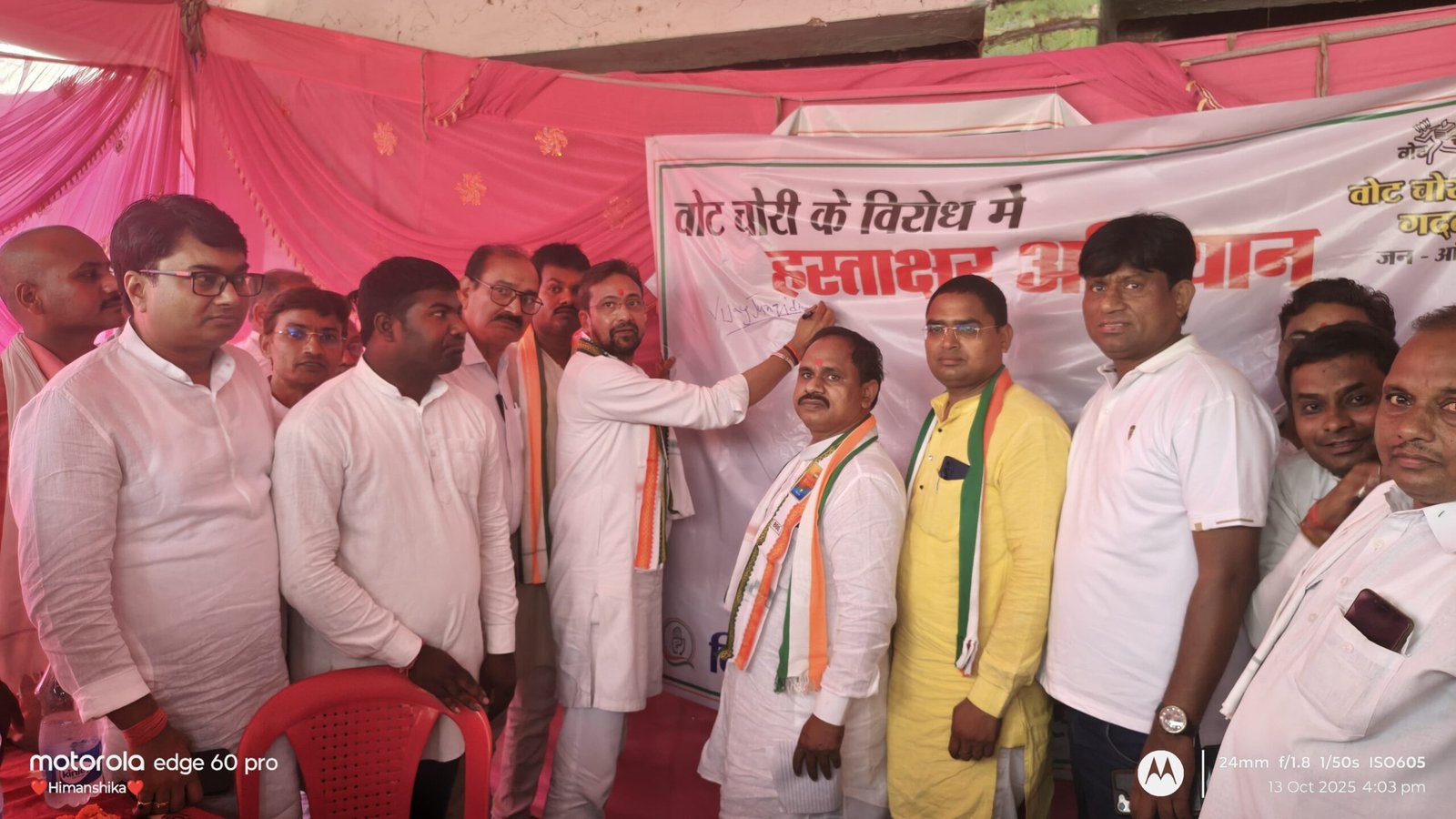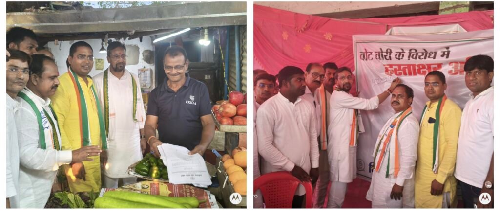 लहरिया ने कहा कि कांग्रेस कार्यकर्ता हर गांव, हर वार्ड तक जाकर जनता को बताएंगे कि किस तरह जनता के वोट की चोरी हुई है। हमारे नेता राहुल गांधी ने सच्चाई और जनता के अधिकार की लड़ाई शुरू की है। अब छत्तीसगढ़ की धरती से यह आग पूरे देश में फैलेगी। ब्लॉक कांग्रेस अध्यक्ष राजेंद्र धीवर ने कहा कि यह हस्ताक्षर अभियान किसी पार्टी के खिलाफ नहीं, बल्कि उस व्यवस्था के खिलाफ है जो जनता के जनादेश को नकारती है। आज कांग्रेस का हर कार्यकर्ता संविधान और लोकतंत्र के लिए खड़ा है। उन्होंने कहा कि कांग्रेस संगठन गांव-गांव तक जाकर लोगों को लोकतंत्र की ताकत का एहसास कराएगा। हम चाहते हैं कि हर नागरिक यह समझे कि वोट की ताकत सबसे बड़ी ताकत है उसे कोई चुरा नहीं सकता। अब जनता खुद तय करेगी कि किसे सत्ता में रहना है और किसे गद्दी छोड़नी है। इसके बाद छग सहप्रभारी विजय जांगिड़ ने बैनर पर हस्ताक्षर कर अभियान की शुरुआत की। कार्यक्रम स्थल पर बड़ी संख्या में कांग्रेस कार्यकर्ताओं, व्यापारियों एवं आम नागरिकों ने फार्म भरकर और हस्ताक्षर करके अपना समर्थन दिया। कार्यक्रम में प्रमुख रूप से ब्लॉक कांग्रेस अध्यक्ष राजेंद्र धीवर, सहकारिता प्रकोष्ठ जिलाध्यक्ष दुबे सिंह कश्यप, वीरेंद्र शर्मा, समीर अहमद, किसान नेता प्रमोद जायसवाल, केश शिल्प बोर्ड उपाध्यक्ष चित्रकांत श्रीवास, जिला युकां उपाध्यक्ष राजू सूर्यवंशी, विजय गुप्ता, दुर्गा तिवारी, भोला साहू, उमेश चंद्राकर, राजेश्वर साहू, धनिदास महंत, भागीरथी पोरते, दर्राभांठा सरपंच एन.एल. घृतलहरे, मनोहर पात्रे, ईश्वर पाटनवार, बुटन पाटनवार, दीपक यादव, उमेश कश्यप, जानू टंडन, सोनू लास्कर सहित बड़ी संख्या में कांग्रेस कार्यकर्ता व आमजन उपस्थित रहे।