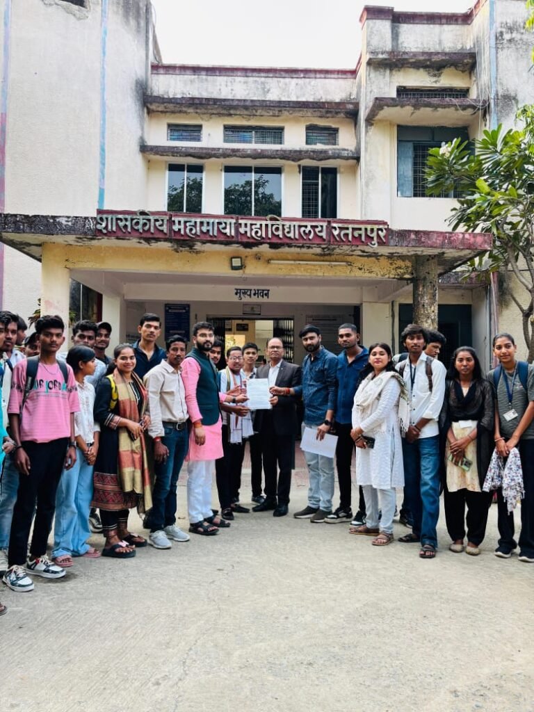 रतनपुर…एनएसयूआई के प्रदेश उपाध्यक्ष शशांक (लक्की) मिश्रा एवं प्रदेश सचिव राजा रावत के नेतृत्व में रतनपुर स्थित महामाया कॉलेज के लाचार व्यवस्था से परेशान छात्रों के हितों को देखते हुए आज 10 सुत्रीय प्रमुख मांगो को लेकर रतनपुर एनएसयूआई के छात्र नेता मानस ताम्रकार,आदित्य साहू,माही राजपूत सहित सैकड़ो महाविद्यालय में अध्ययनरत छात्रों के साथ प्राचार्य को ज्ञापन सौंपा, विदित हो कि शासकीय महामाया महाविद्यालय रतनपुर आसपास क्षेत्र का बड़ा महाविद्यालय है जिसमे दूर दूर से छात्र-छात्राए अध्ययन हेतु आते है जिन्हे कई सारी समस्याओं का सामना करना पड़ता है जिसके निराकरण हेतु आज ज्ञापन सौपा गया