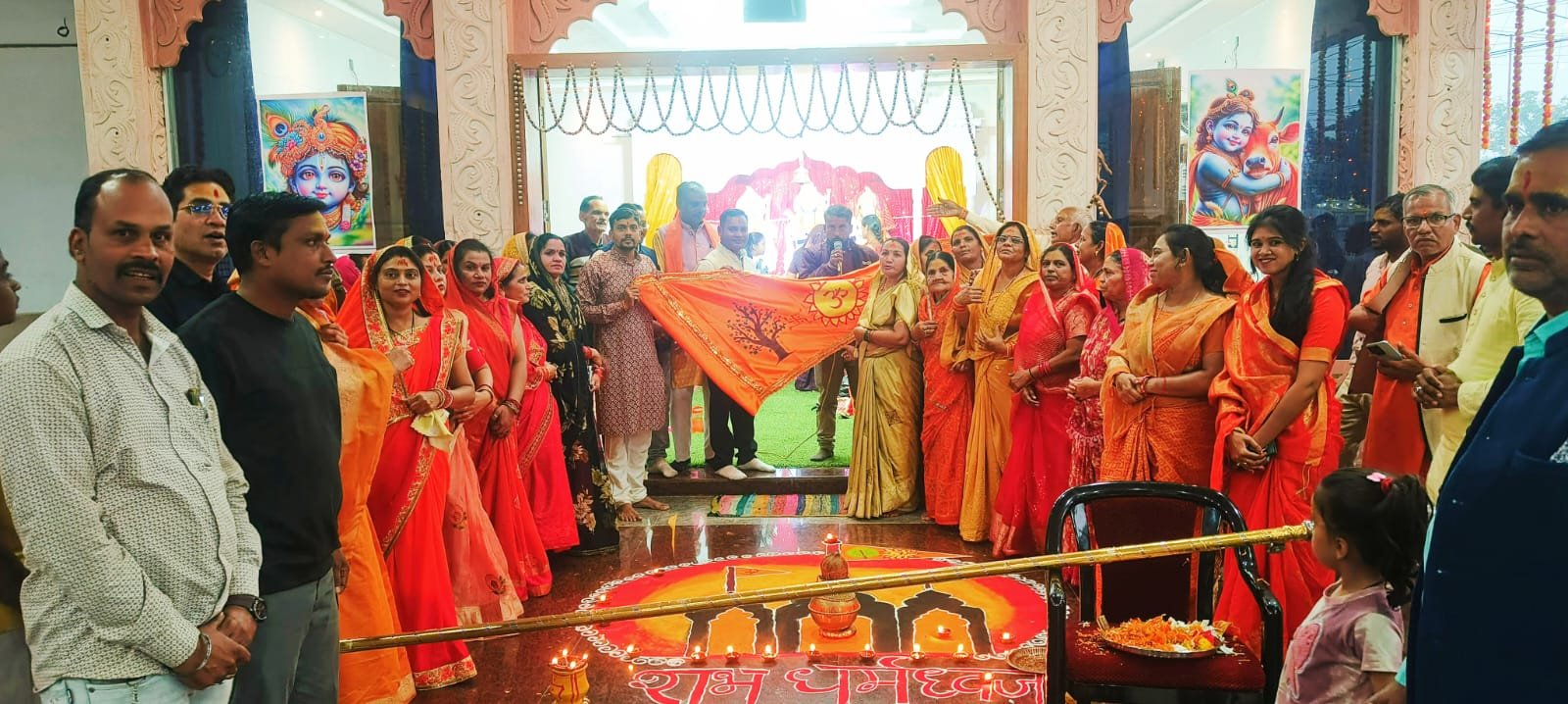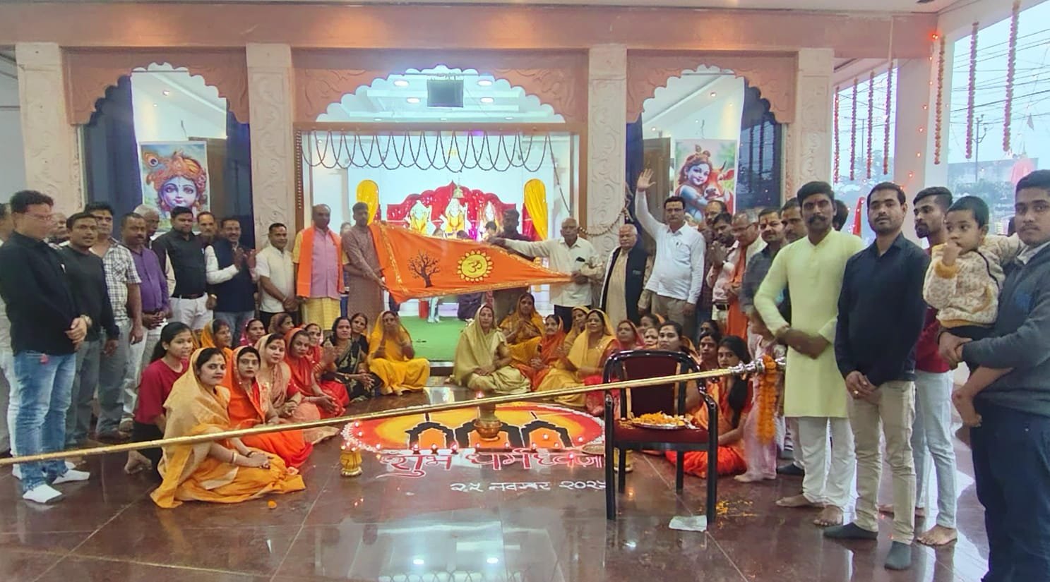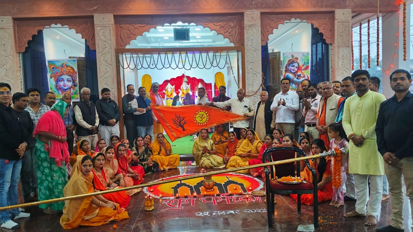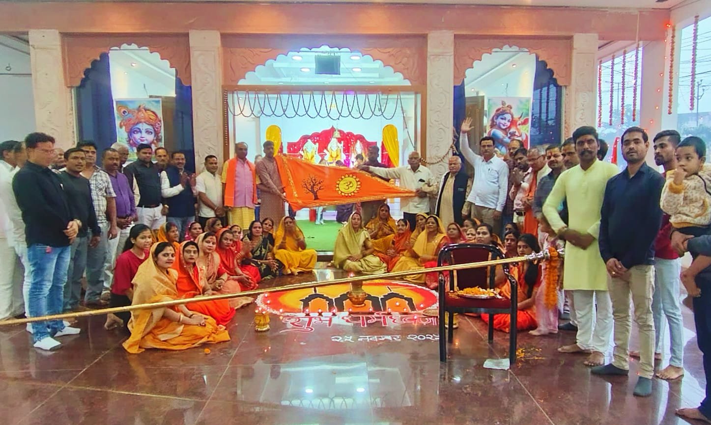 जिसमें सर्वप्रथम भगवा ध्वज का पूजा आरती तत्पश्चात पटाखा फोड़ते हुए जय श्री राम के नारों के साथ भगवा ध्वज को श्री राममंदिर शिखर पर फहराया सभी ने भगवान के भक्ति में भजन में झूमते हुए धूमधाम से भगवा ध्वज का पूजा किया मुख्य रूप से कोमल सिंह ठाकुर ने कहा 5 वर्ष की तपस्या पूर्ण होने पर अयोध्या भगवान श्री राम लाल के भव्य मंदिर निर्माण के उपलक्ष पर 25 नवंबर को धर्म ध्वज फहराया गया