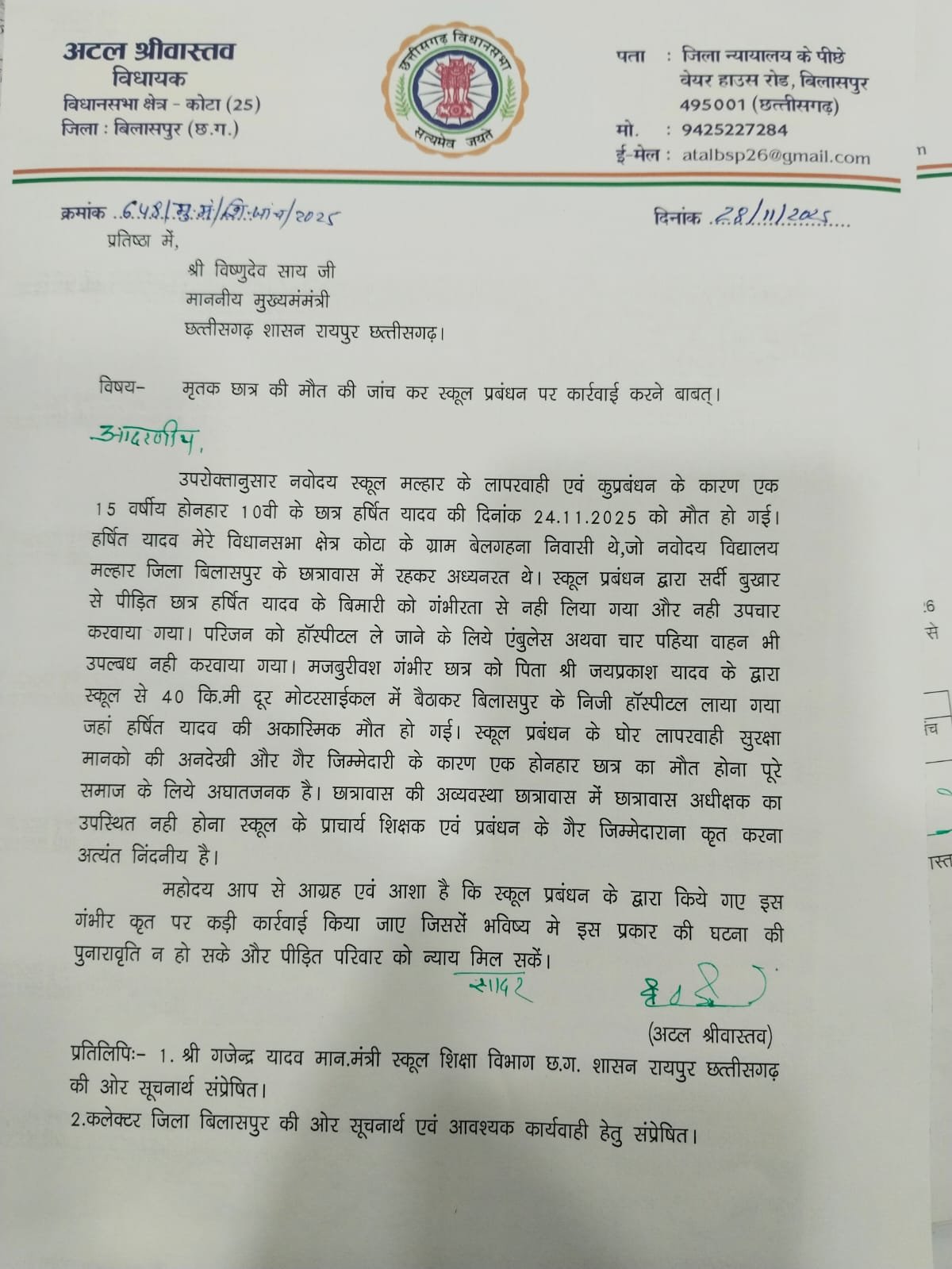 स्कूल प्रबंधन पर कार्रवाई करने अटल श्रीवास्तव ने मुख्यमंत्री शिक्षा मंत्री एवं कलेक्टर बिलासपुर से की मांग