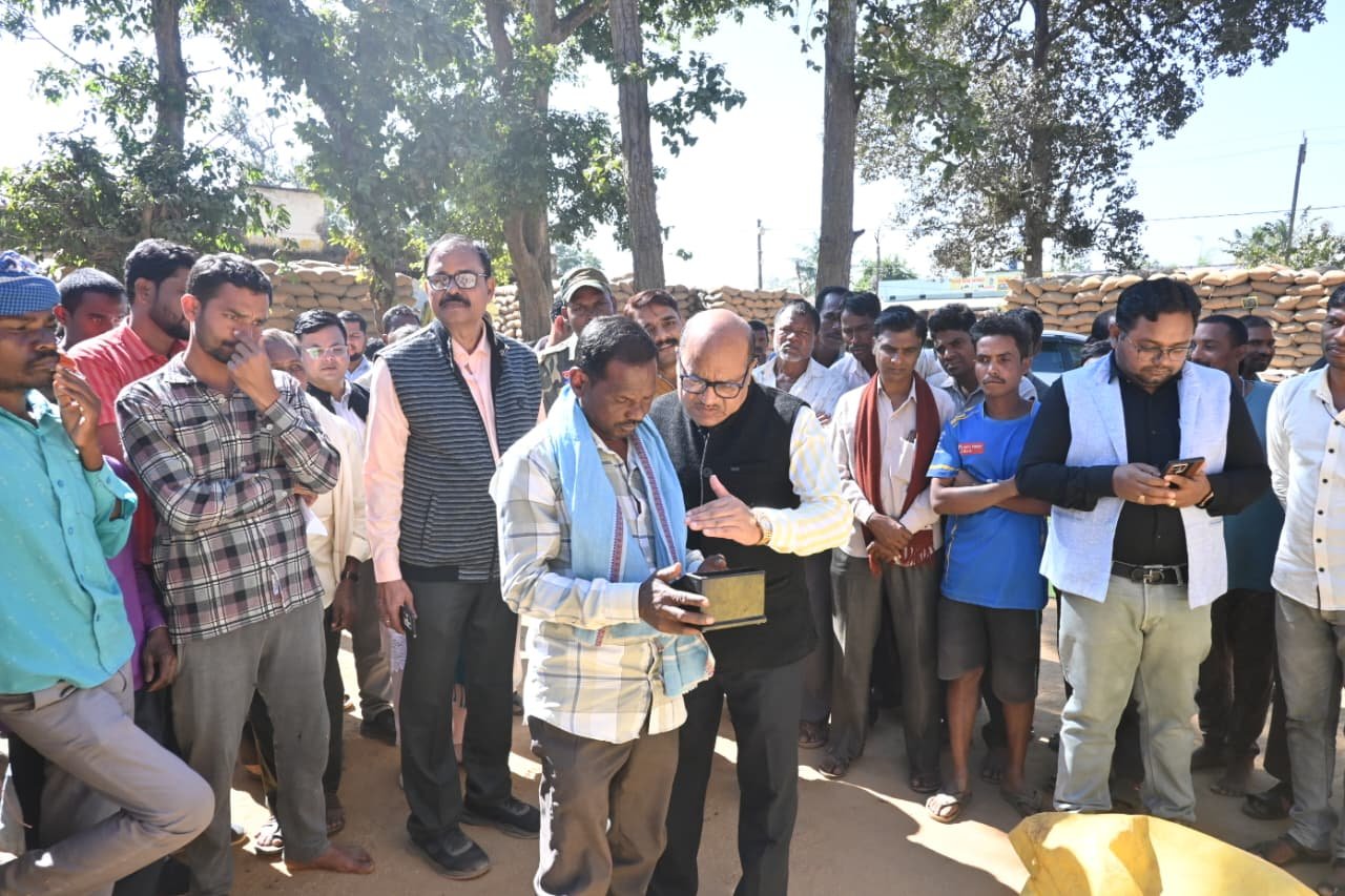 *गरियाबंद*:- जिले में समर्थन मूल्य पर धान खरीदी प्रक्रिया को पारदर्शी, व्यवस्थित और किसान-हितैषी बनाए रखने के उद्देश्य से कलेक्टर श्री बी.एस. उइके ने आज मैनपुर क्षेत्र के अंतर्गत जिड़ार, शोभा, नउमुड़ा, धवलपुर और बिन्द्रनवागढ़ सहित विभिन्न धान उपार्जन केंद्रों का औचक निरीक्षण किया। उन्होंने केंद्रों में संचालित सभी व्यवस्थाओं का प्रत्यक्ष अवलोकन कर आवश्यक निर्देश दिए। निरीक्षण के दौरान कलेक्टर श्री उइके ने समिति प्रबंधकों को निर्देशित किया कि किसानों द्वारा धान परिवहन के लिए उपयोग किए जा रहे वाहनों के लाइव फोटो को शत-प्रतिशत पोर्टल पर अपलोड करना अनिवार्य रूप से करें। उन्होंने कहा कि इससे खरीदी प्रक्रिया में पारदर्शिता बनी रहेगी और किसी भी प्रकार की अनियमितता पर प्रभावी नियंत्रण किया जा सकेगा।
