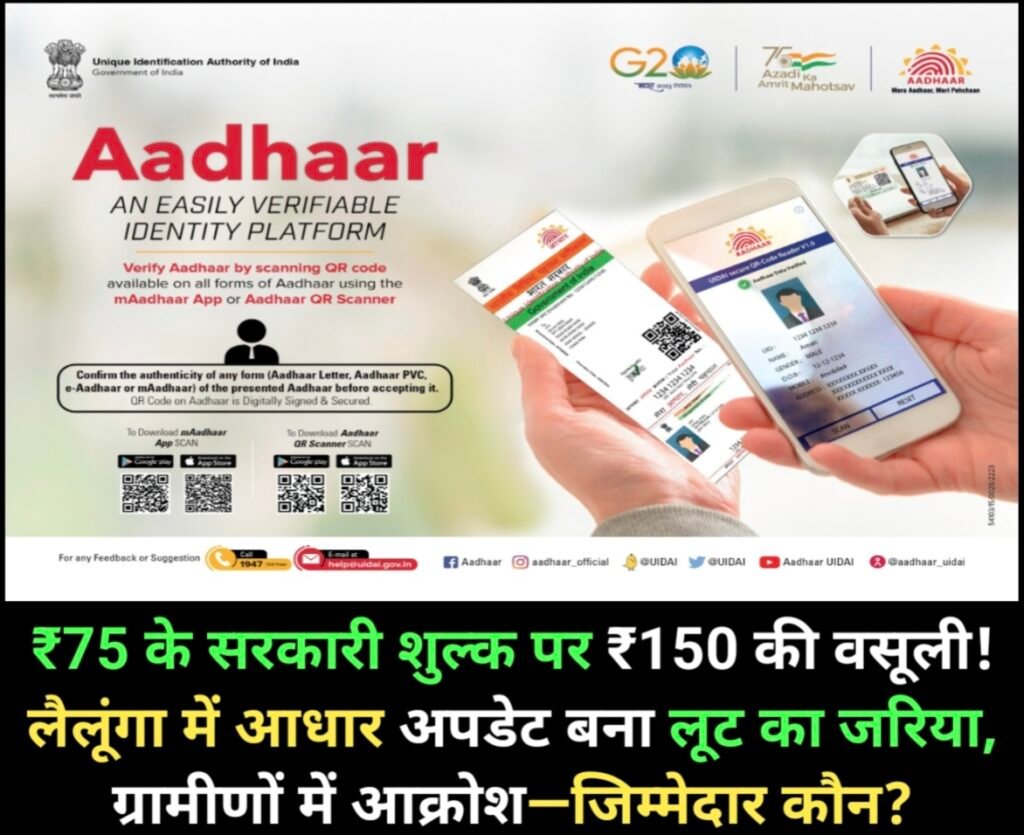 लैलूंगा में आधार कार्ड में नाम, जन्मतिथि, मोबाइल नंबर व अन्य सुधार के नाम पर सरकारी रूप से तय ₹75 शुल्क के बावजूद ₹150 तक की अवैध वसूली का मामला सामने आया है। डबल वसूली से नाराज़ ग्रामीणों में भारी आक्रोश देखा जा रहा है, वहीं मजबूरी में लोग तय शुल्क से दोगुनी रकम चुकाने को विवश हैं।